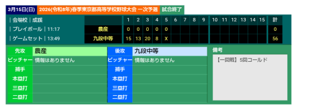 3月15日(日) VS 都立農産高等学校 56ー0(5回コールド) 〇