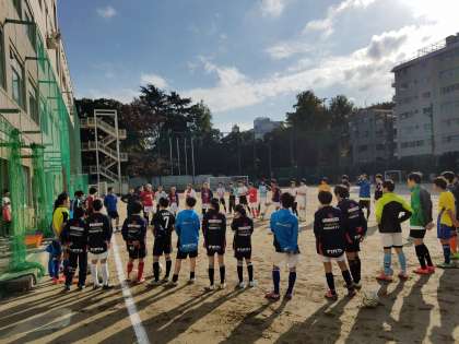11月26日土曜日の午後、本校グランドにて、東京都立九段高等学校サッカー部、千代田区立九段中等教育学校サッカー部のOB会である九蹴会が行われました。九段高校23回生から59回生まで、そして九段中等教育学校の1年生である13回生までのサッカー部員とマネージャー約70名が集まり、ミニゲームや11対11のゲームを通して交流を図りました。